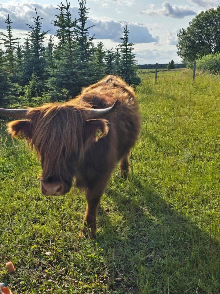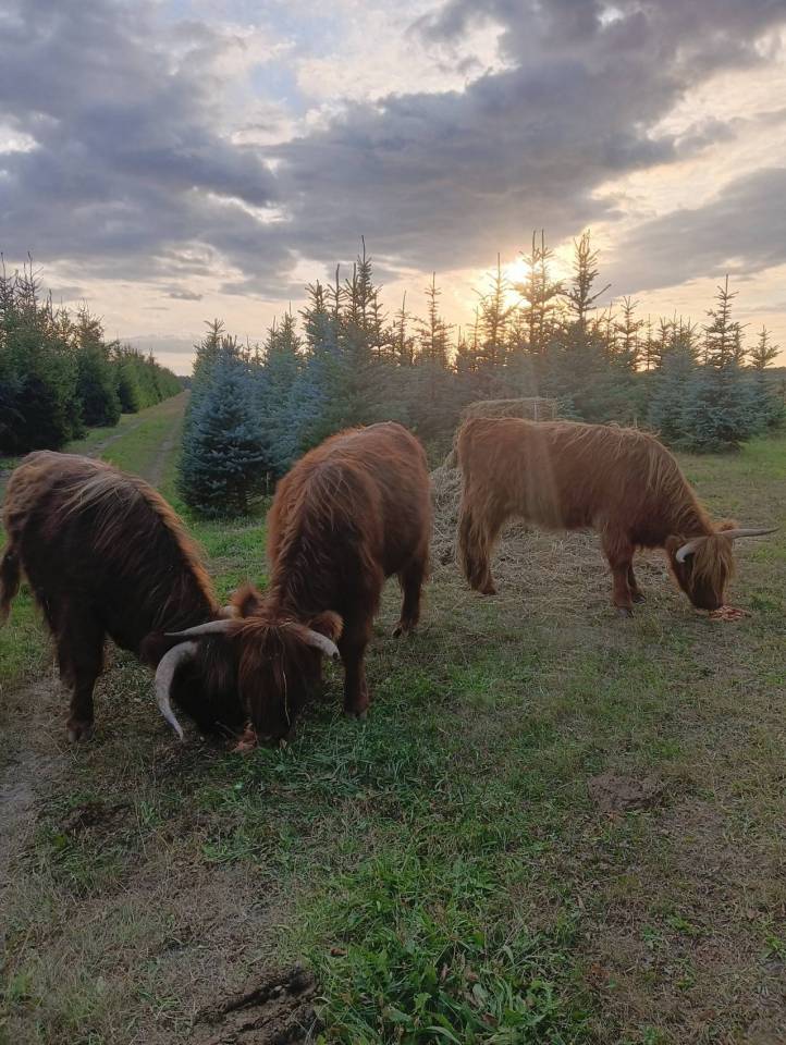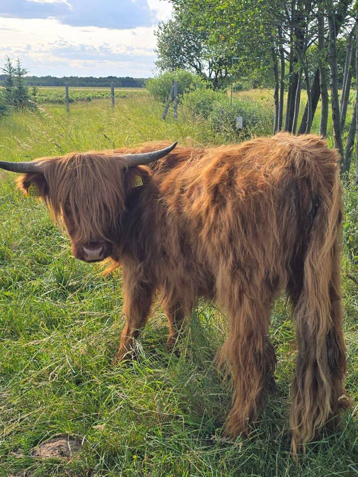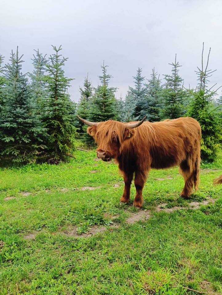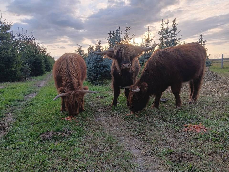 Choć to krówki, porównanie do żubrów wcale nie jest przypadkowe – rude Highland Cattle mają imponujące rogi, gęstą sierść i posturę, której nie sposób nie zauważyć na tle sierpniowych pól.